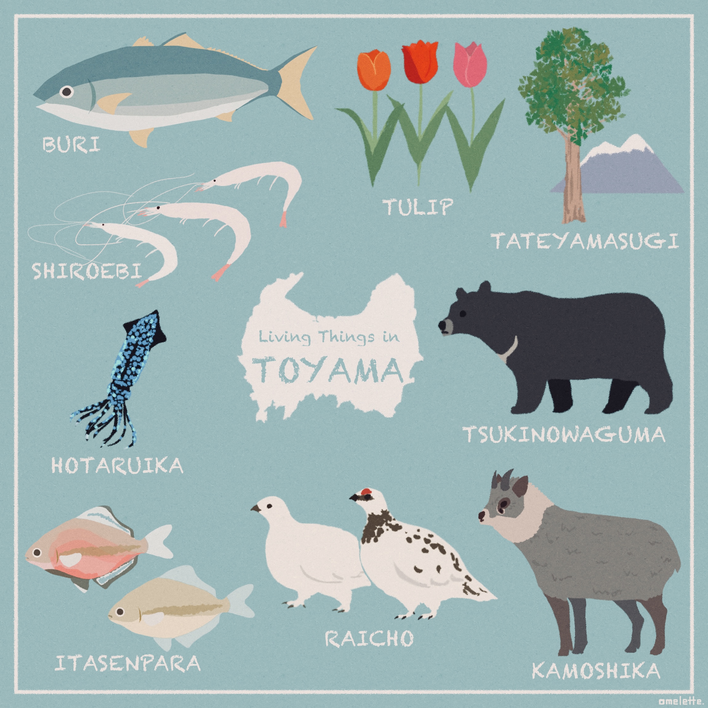 現在は間口を広げ動物全般をモチーフとする作品を数多く発表している。”形としての心地よさ”を追求した主線なしイラストを得意とする。